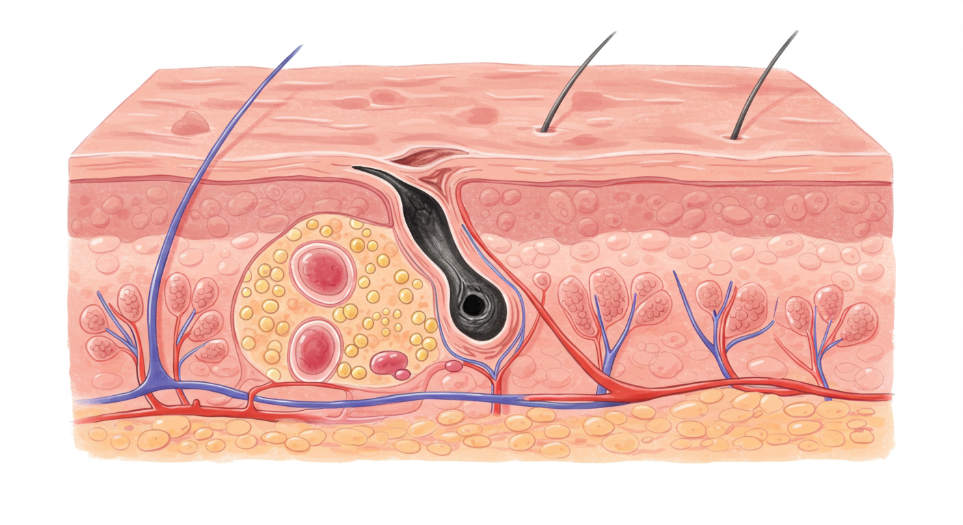 皮膚の下に袋状の構造ができ、その中に皮脂や角質が溜まっていくことで形成されます。見た目は皮膚の下にできるしこりのようで、多くの場合、中央に黒い毛穴のような開口部が見られます。