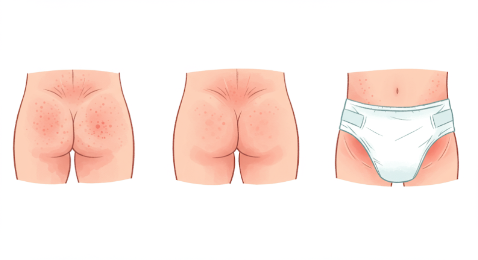 具体的には、おしり・陰部・太ももの付け根などに赤みやブツブツ、ただれが見られる状態を指します。症状が軽いうちはうっすらと赤い程度ですが、悪化すると痛みを伴うこともあります。