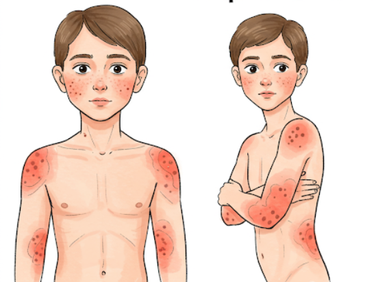 思春期以降は、下半身よりも上半身で発疹がよく見られます。顔、首から胸にかけて、背中などに発疹が強く出る傾向があります。